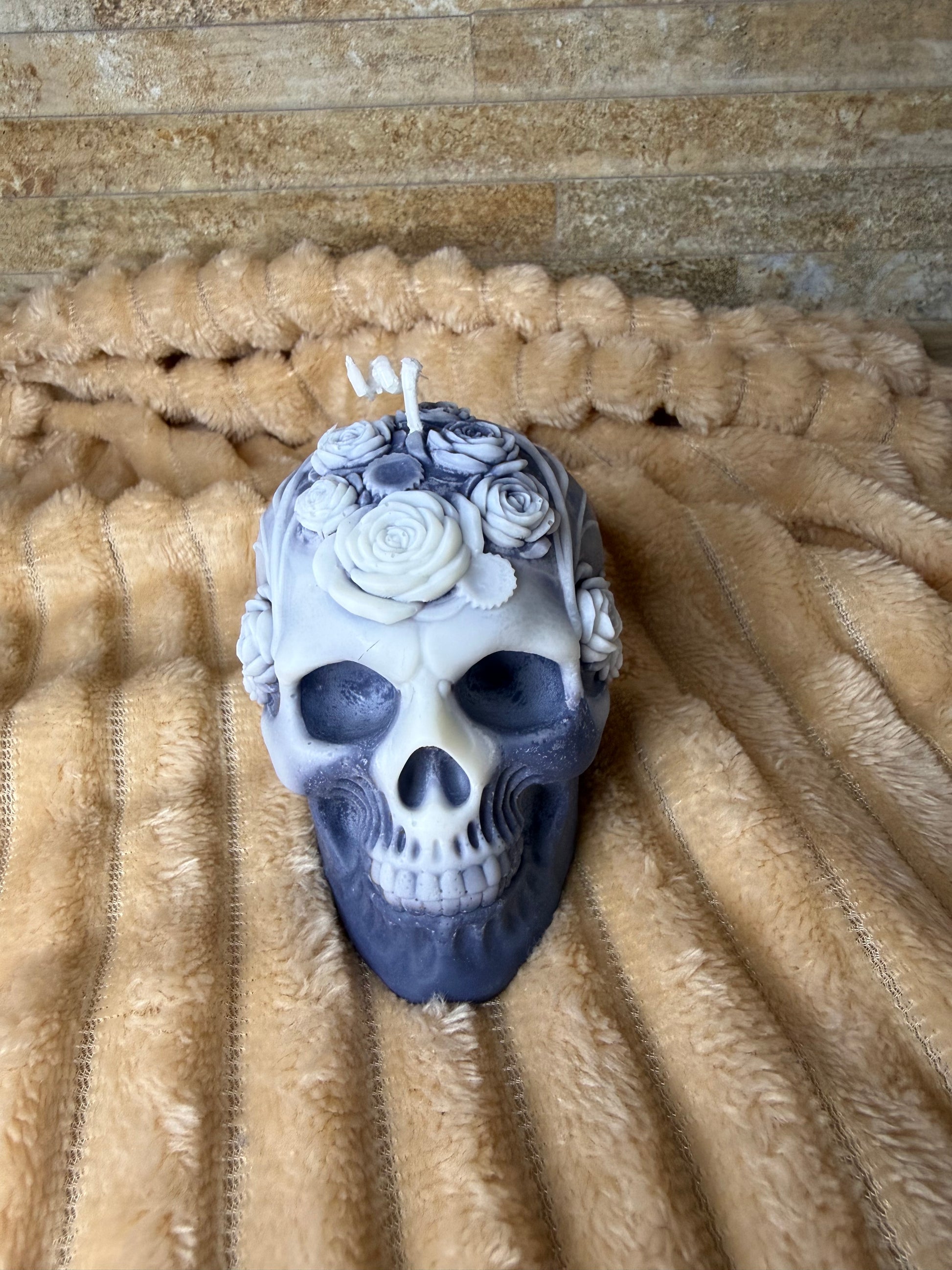Vela de cera de soja 100% natural, con forma de calavera y unas rosas en la parte alta y laterales, ideal para decorar tu hogar en esta época del año.