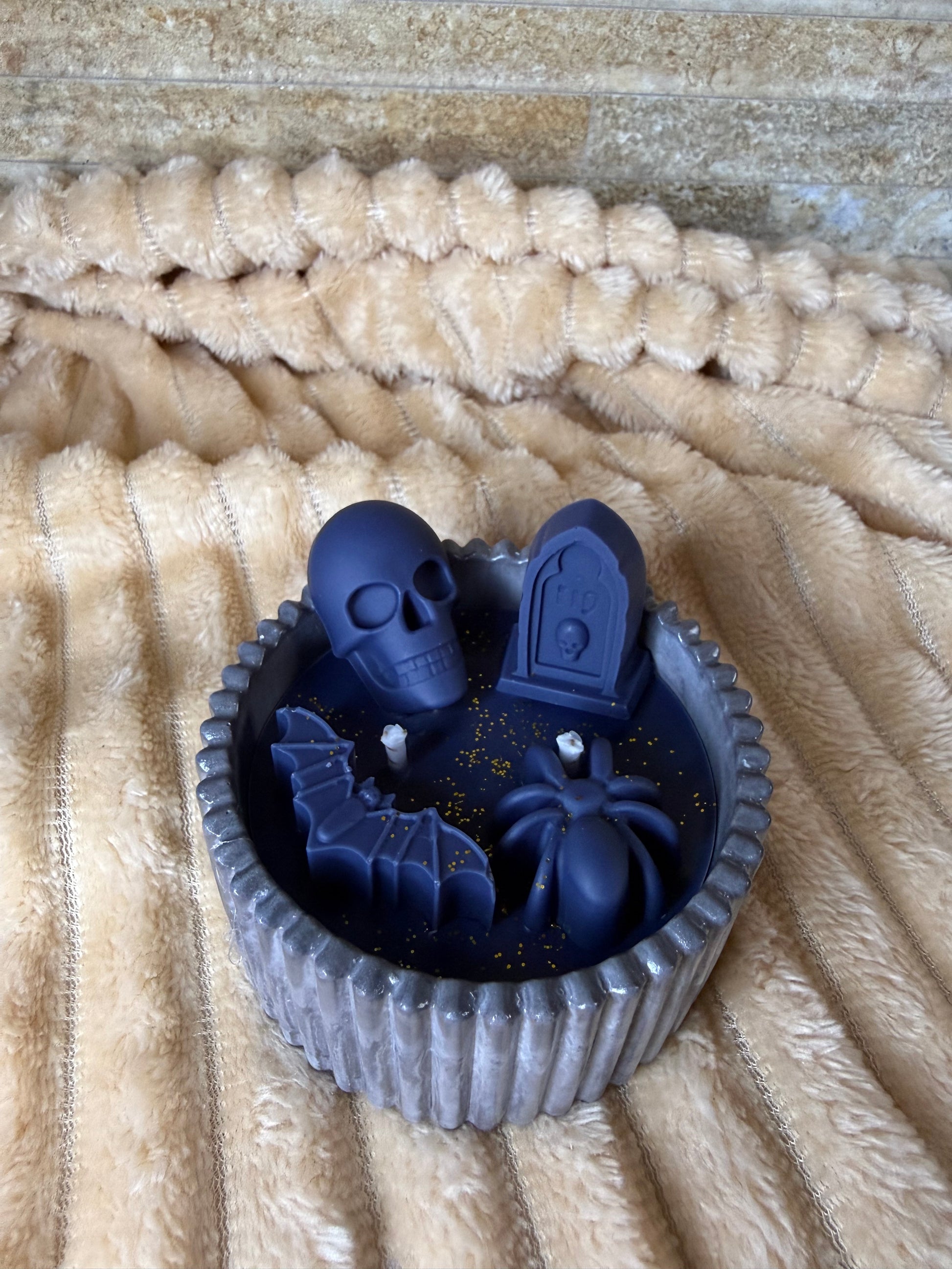 Vela hecha en un recipiente artesanal, recreando un cementerio y perfecta para decorar tu hogar en esta época del año.