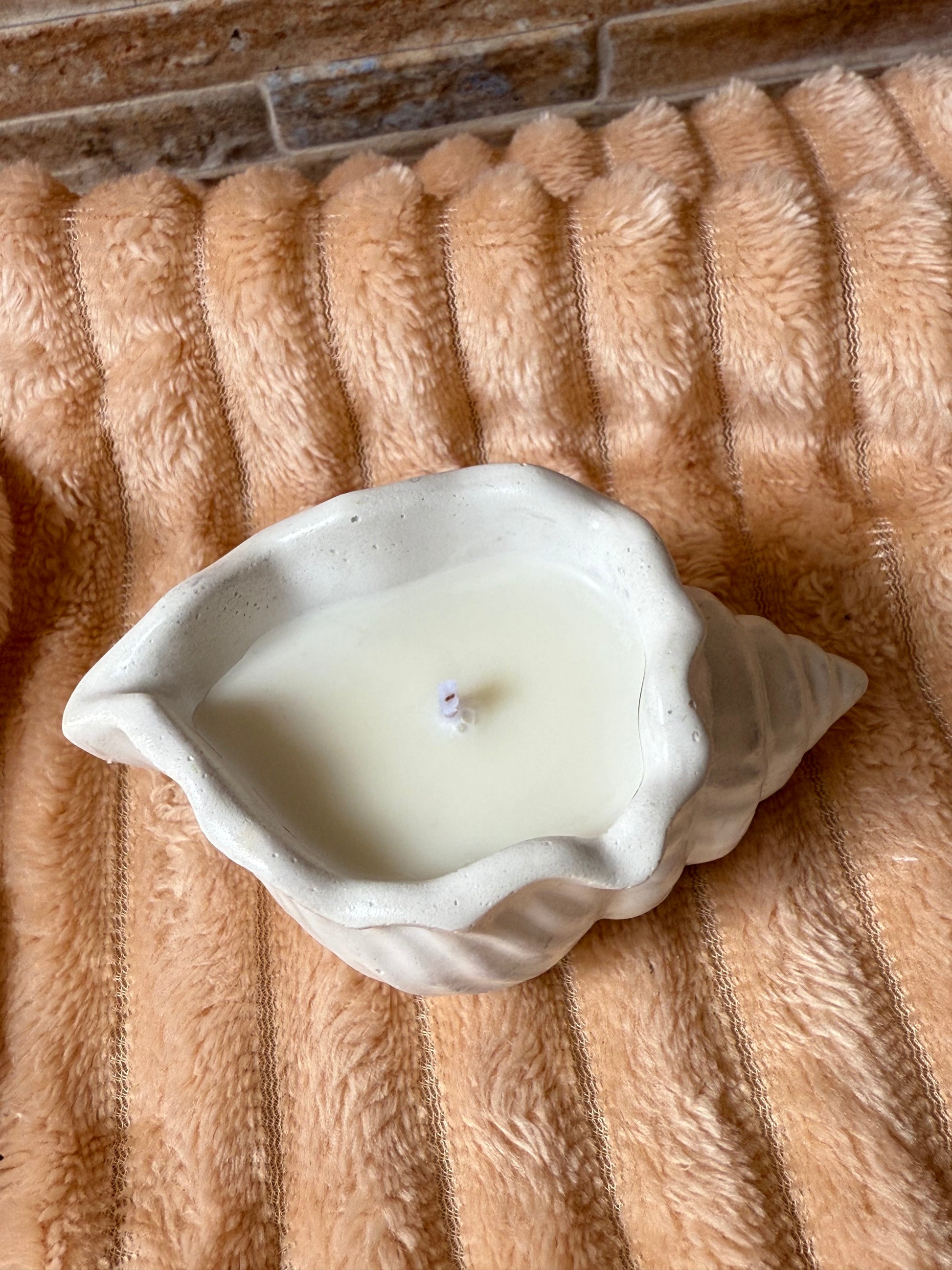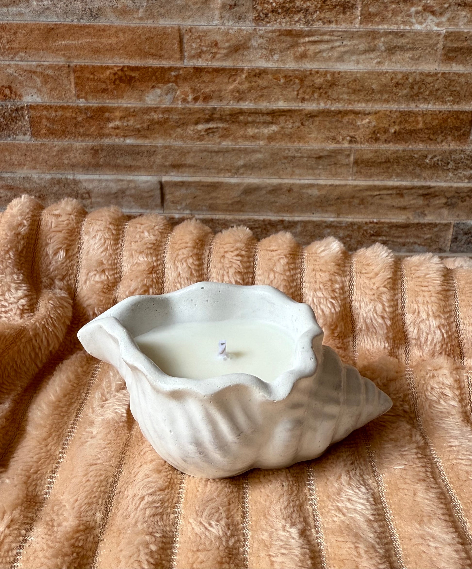 Vela aromática en un recipiente artesanal hecho por nosotros con forma de caracola y con cera 100% de soja que llenará tu estancia con el olor fresco del agua del mar.
