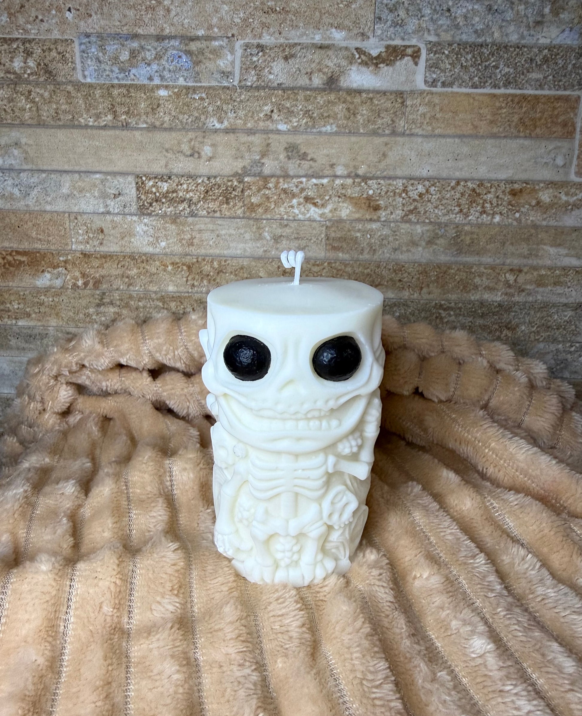 Vela de tubo con un esqueleto en relieve, tanto por delante como por detrás, perfecta para decorar tu hogar en esta época del año.