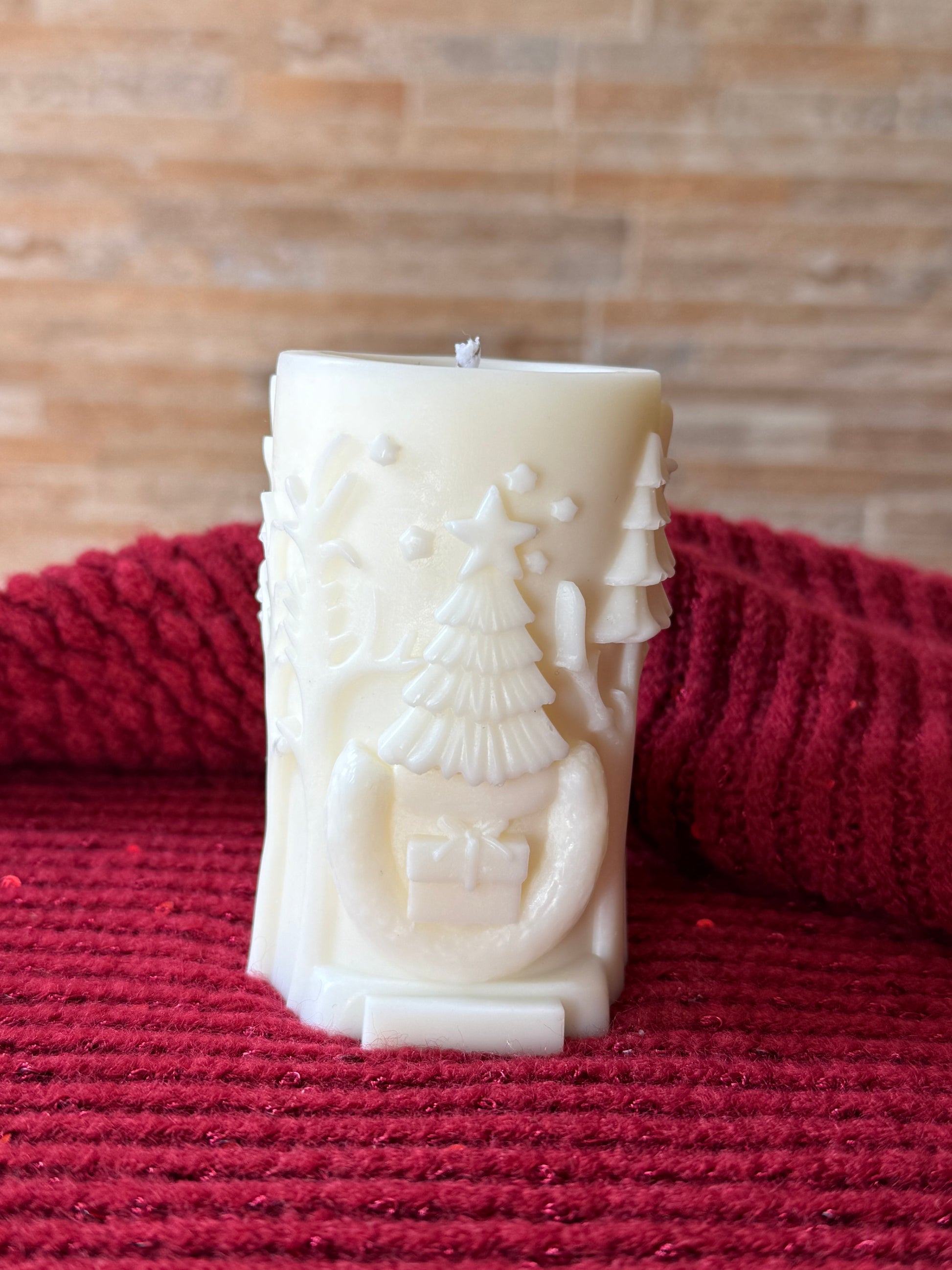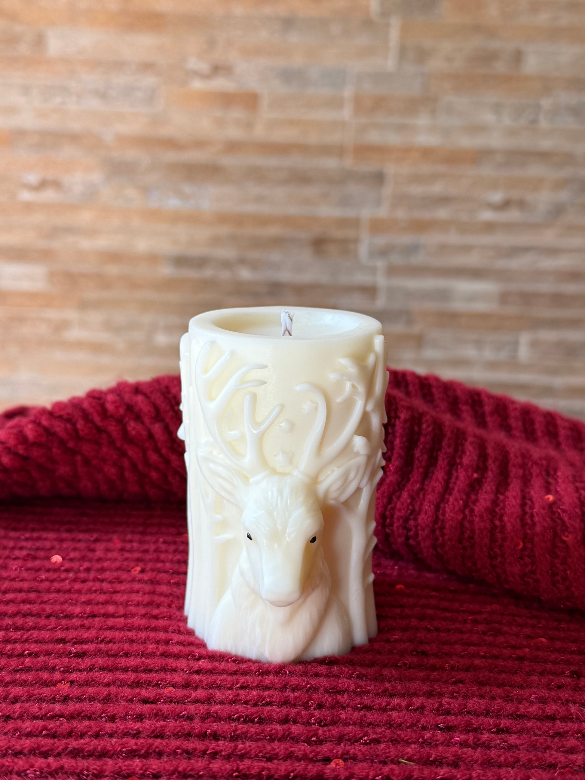 Vela 100% cera de soja con forma de tronco y con un ciervo que sobresale para decorar tu casa con elementos navideños.